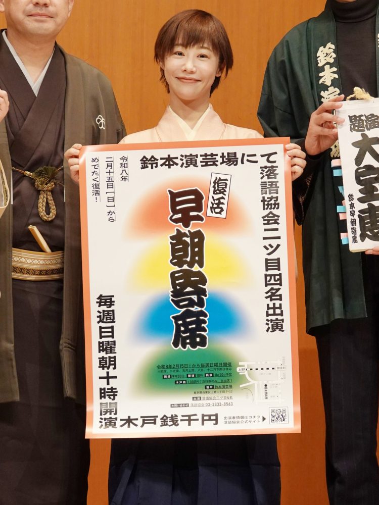 2026年2月15日、上野・鈴本演芸場にて「早朝寄席」が8年ぶりに復活します。これに先立ち行われた記者会見に、落語家の蝶花楼桃花が、春風亭一之輔さん、弁財亭和泉さん、三遊亭萬都さん、鈴本演芸場の鈴木敦代表取締役と共に出席しました。