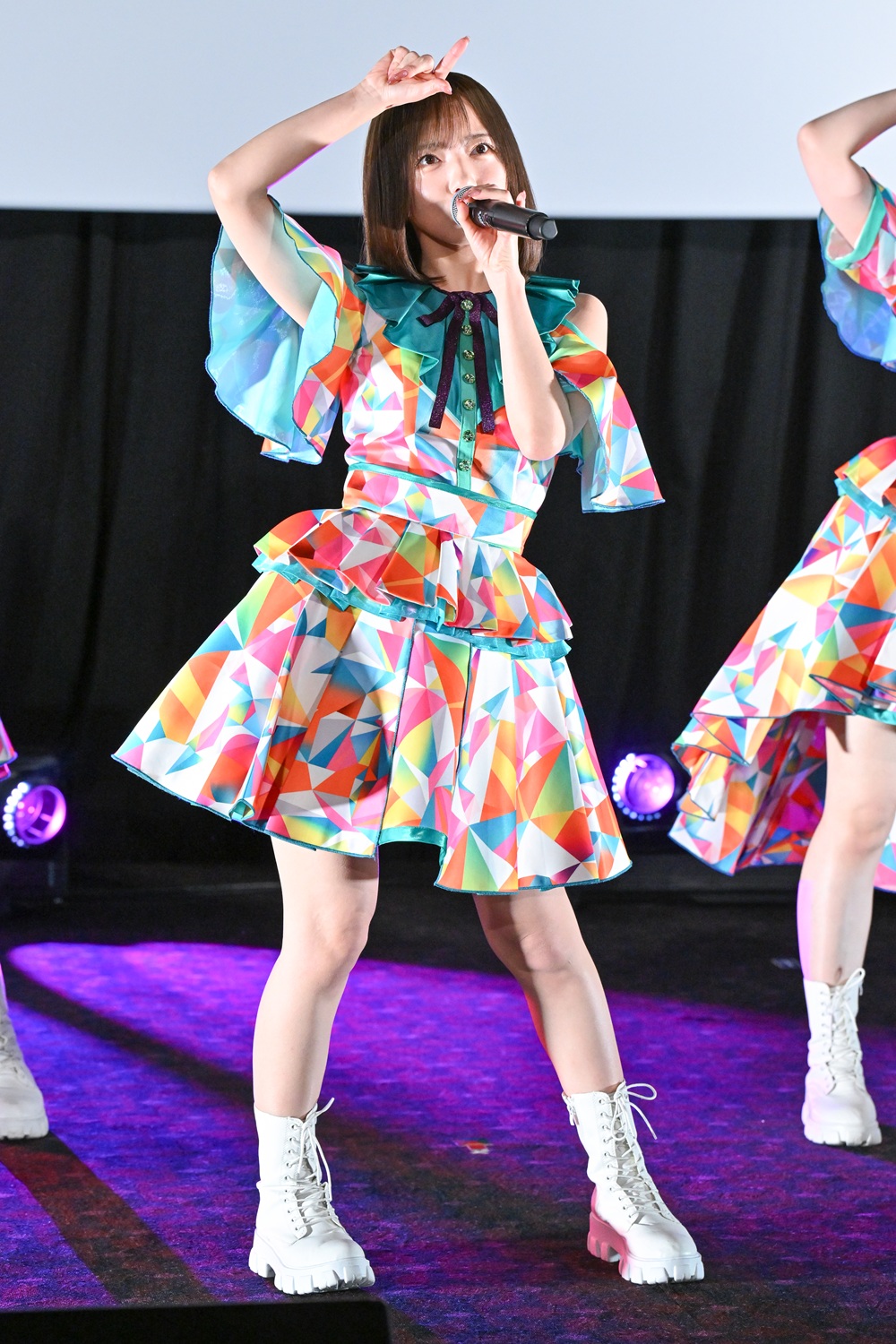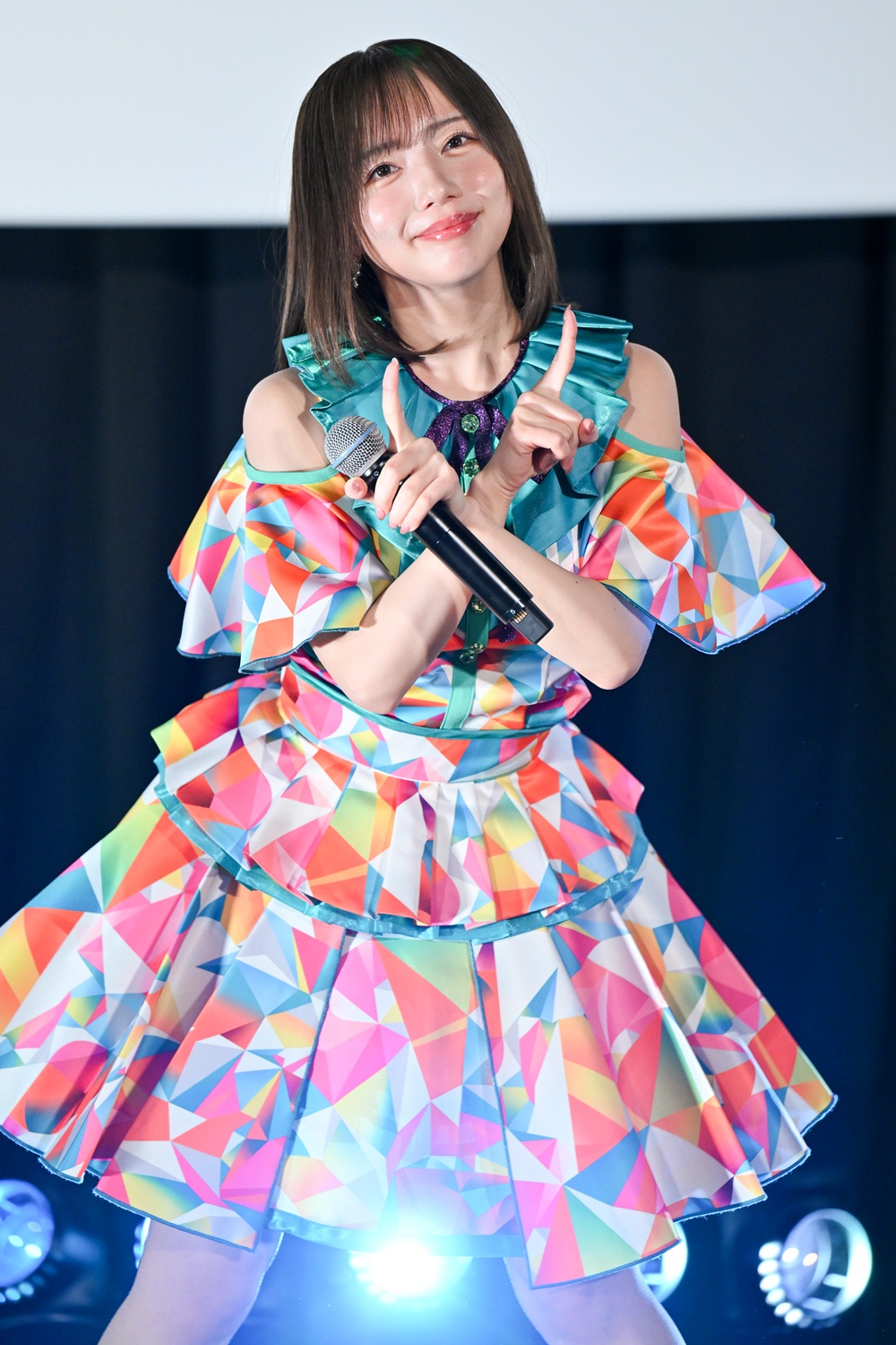舞台挨拶の前に、劇中でアイドル『ハッピー☆ファンファーレ』を演じた5人が、劇中歌『秒速ラヴァー』と『君色ナミダ』の2曲を劇中衣装で生披露。まず、『秒速ラヴァー』を披露して会場に詰めかけたファンを沸かせ、その後のMCで齊藤は「“まいまい”こと山岡真衣です。よろしくお願いします」と挨拶。日向坂46でセンター経験もある齊藤ですが「久しぶりのダンスだったので、すごく緊張しましたね。今もけっこう汗だくって感じです!」と吐露しました。