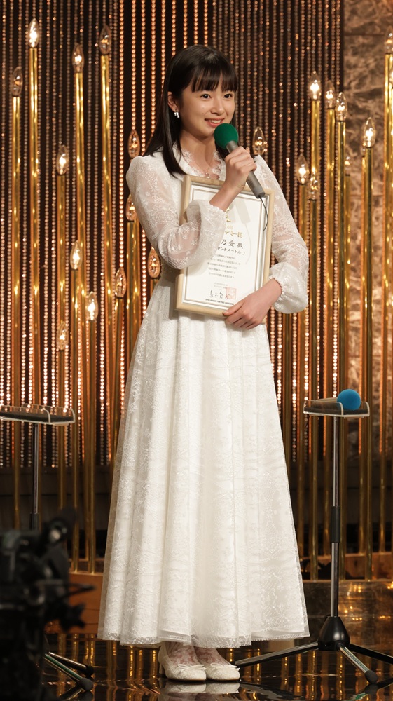 3年前に自身が俳優デビューをした頃を振り返り、「初めて台本をいただいたときにお芝居の楽しさを知り、もっといろんな役を演じたいと思うようになりました。しかし、経験を重ねていくうちに、お芝居の難しさも感じるようにもなりました。上手く表現ができなくて悔しいと思ったことが何度もありますが、そんな時でも不思議とワクワクしている自分がいます。その自分に気付いたときに、この先も俳優というお仕事を続けたいと強く思いました」と、俳優の道を進む覚悟を語り、「まだまだ未熟ですが、俳優として、一人の人間として成長して、またいつかこの場所に戻ってこられるように頑張ります」と、更なる飛躍を誓ってスピーチを締めくくりました。